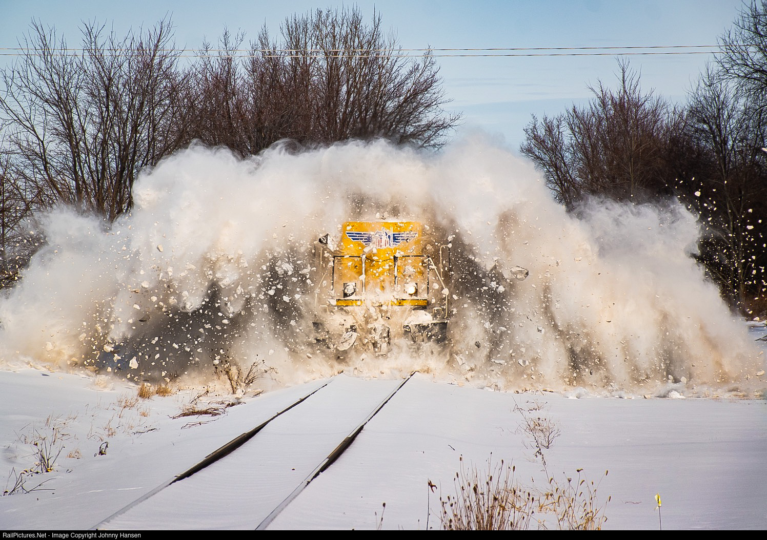 | 2 - 3” inches of snow and 50 MPH winds over the Christmas Holiday weekend have scattered snow drifts all over the Union Pacific’s Troy Grove Subdivision. The Troy Grove Job has made it’s first run down the line since, which ended up creating multiple snow explosions/drift busting along the line from DeKalb to Troy Grove. They are seen here busting through a more quite sizeable drift in the small unincorporated community of McGirr, IL. |