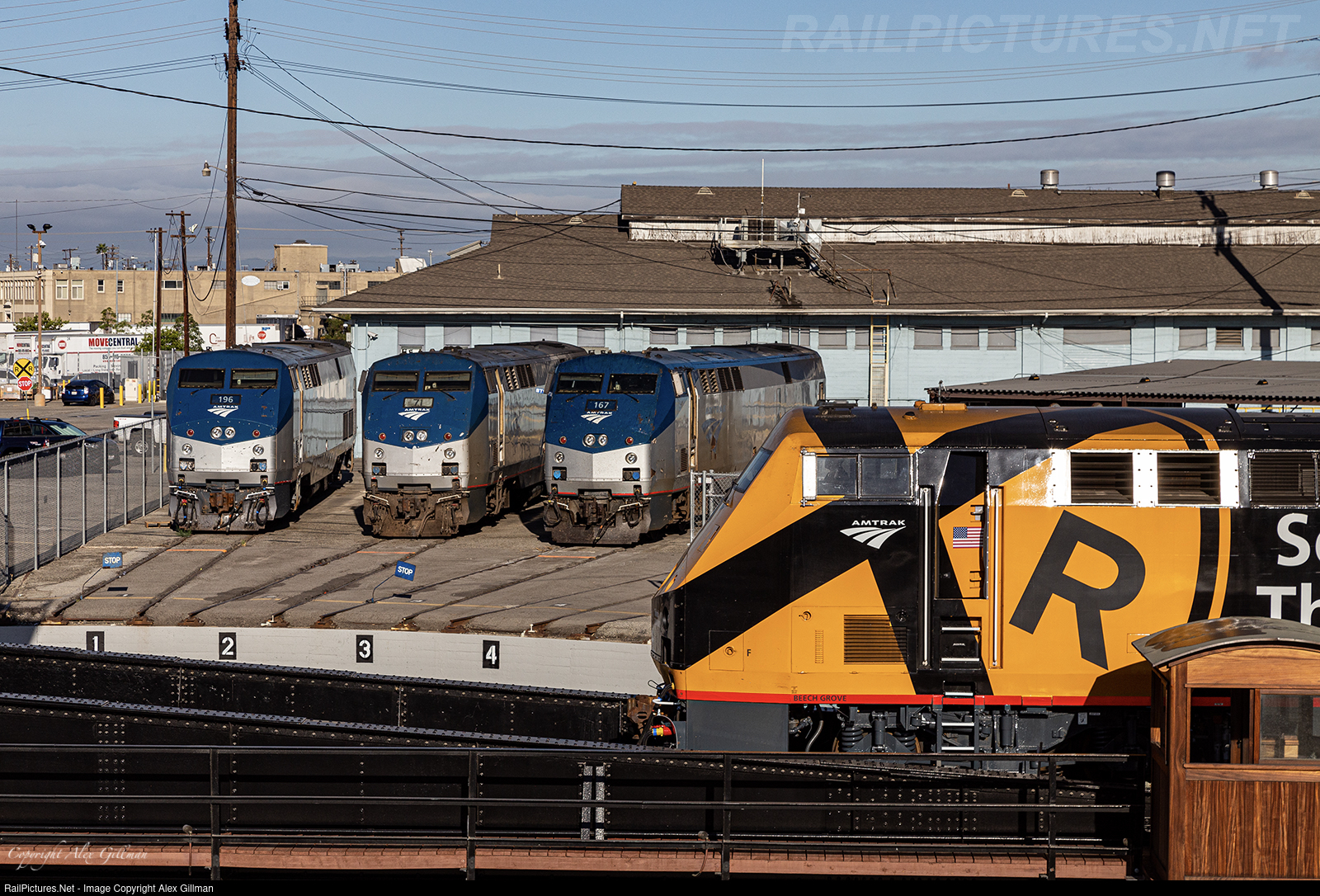 Following days of prep at Amtrak's Redondo Junction locomotive servicing facility, AMTK 203, wearing a commemorative paint scheme celebrating Operation Life Saver's 50th Anniversary, eases off the ex-Santa Fe turntable and prepares to join Santa Fe 3751. The following day, the 203 and 4-8-4 would travel to Fullerton to take part in Amtrak's first "Amtrak Track Safety Community Event." In the background, a lineup of fellow P42's looks on - a scene that isn't too far away from fading into the history books as Amtrak continues to take delivery of new SC-44 Chargers from Siemens.