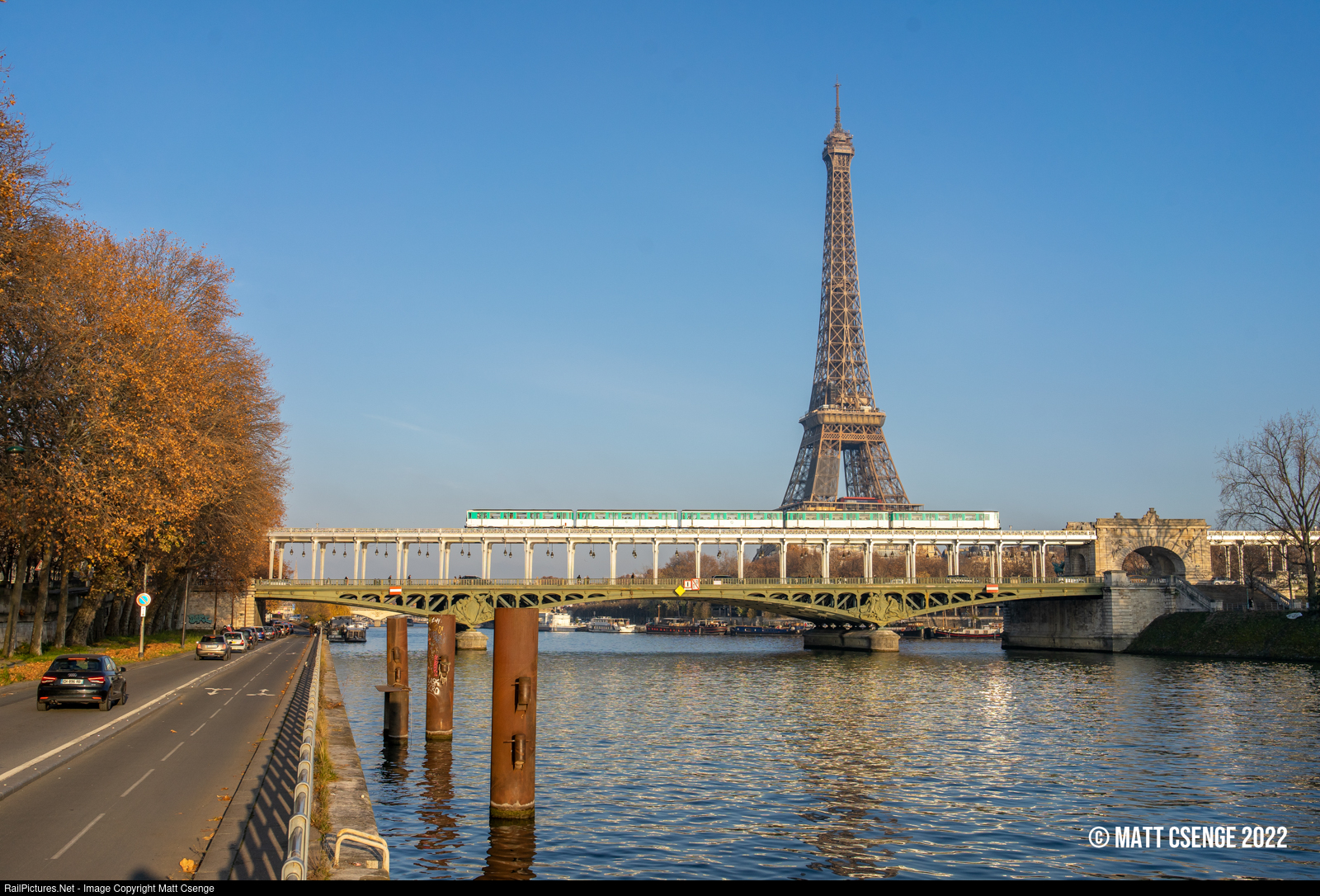 A Paris Métro Line 6 train is seen crossing the Pont de Bir-Hakeim (Bir Hakeim bridge) over the Seine with the iconic Eiffel Tower standing tall in the background.