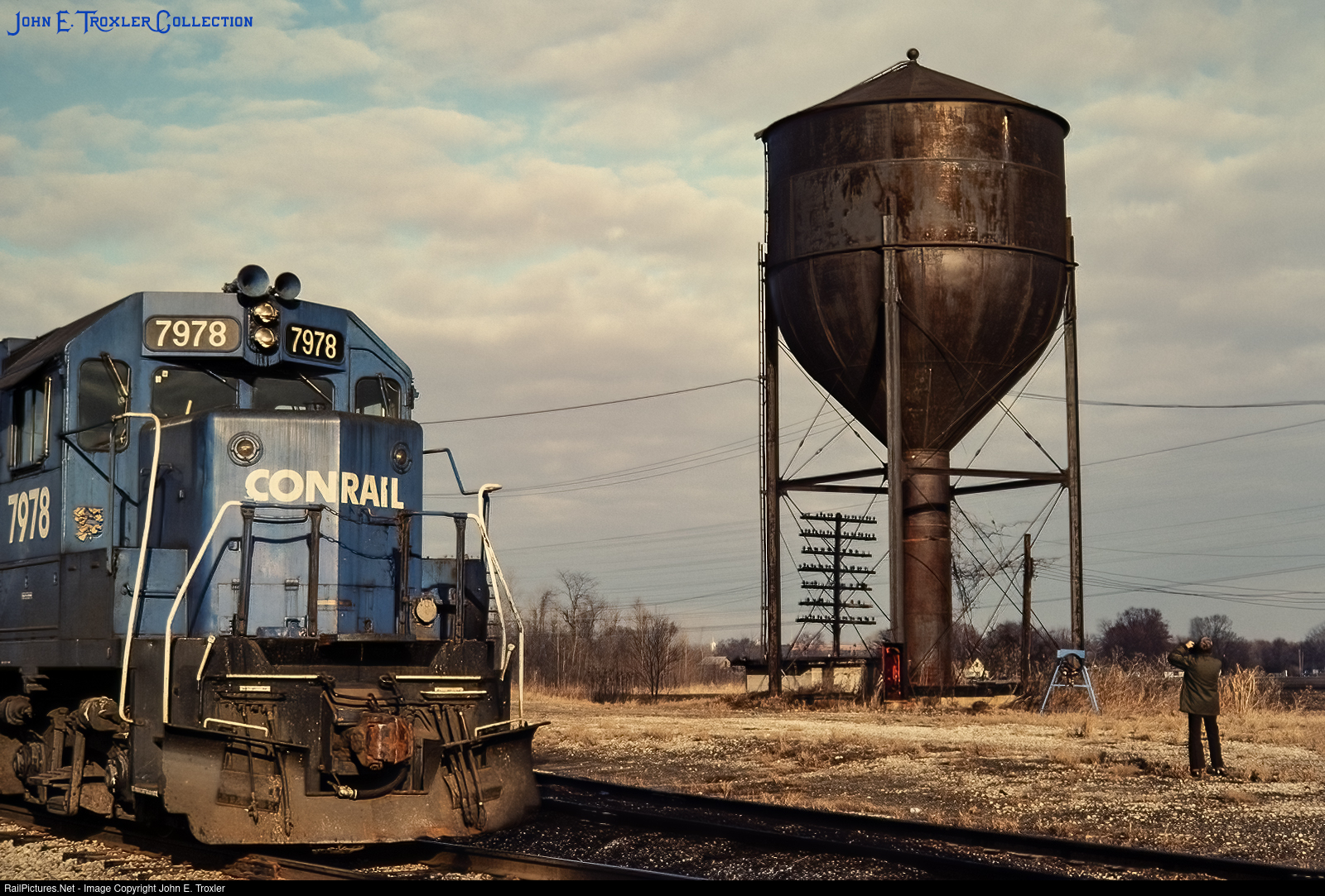 | A Conrail geep sits idle while a railfan photographs one of two last remnants of steam left in the yard. The water tower and the coaling tower, which was out of the frame, were the last 2 remaining steam servicing facilities left on the property in the early 80s. |