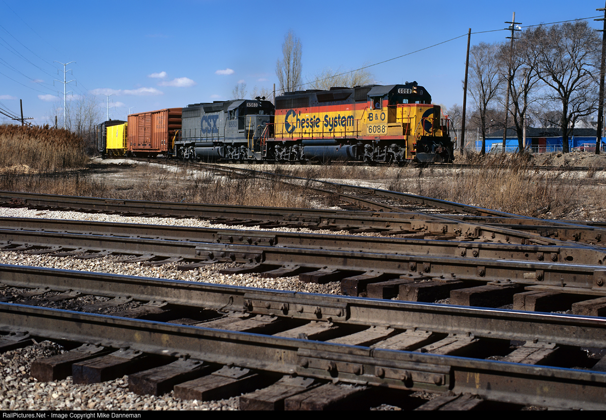 An eastbound CSX freight rolls through busy Dolton Junction at Dolton, Illinois, on March 19, 1988. The train is powered by a Baltimore & Ohio EMD GP40-2 that has recently renumbered into the CSX roster as No. 6088, and CSX EMD GP40 No. 6563, also a former B&O locomotive, now in one of CSX Transportation’s early gray schemes.