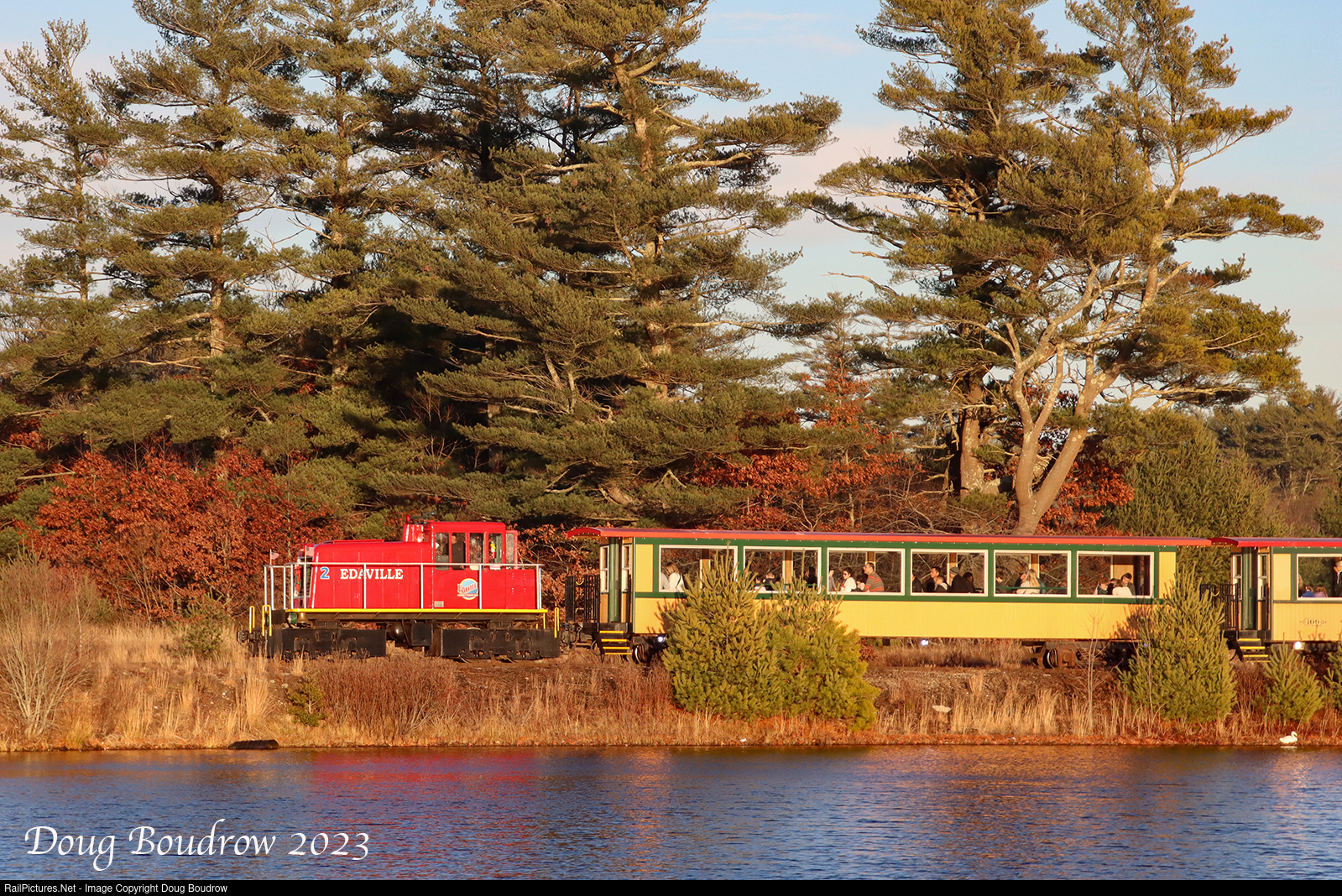 Locomotive #2 is seen coming around the main pond at Edaville, USA. This engine was built by General Electric in 1949 and is classified as a 23-ton switcher. It was part of an order of three units for the Whitin Machine Works in Whitinsville, Mass. Although it was the first day of 2023, it was the last day of the season for Edaville USA. 2022 marked the first season under the new management of Shervin B. Hawley and Brian Fanslau. Ellis D Atwood first opened Edaville Railroad in 1947 in the cranberry bogs of South Carver, Massachusetts. The original collection included most of the surviving Maine 2-foot gauge locomotives and rolling stock. Although Edaville is one of the oldest heritage railroads operating in the United States, the original park closed in 1991. At that time the collection was relocated to Portland at the Maine Narrow Gauge Museum. In 1999 the park was reopened but in 2005 the nearly 6-mile route was shortened to 2.5 miles. The railroad owns two operating steam locomotives although one of them, #21 is undergoing repairs at Maine Locomotive & Machine Works in Alna, Maine. Seen here is #11, built by the Boothbay Railway Village in Boothbay Maine. It is a combination of two 1925 Porter locomotives, #10 and #11 that were longtime display pieces on the Edaville property. Edaville USA is the only railroad with operating steam locomotives in Massachusetts.