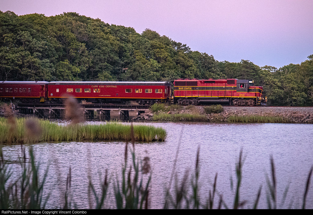 | MC 2010 leads the dinner train southward to North Falmouth, seen here running along the Pocasset River in Pocasset, Bourne, MA just after sunset. |