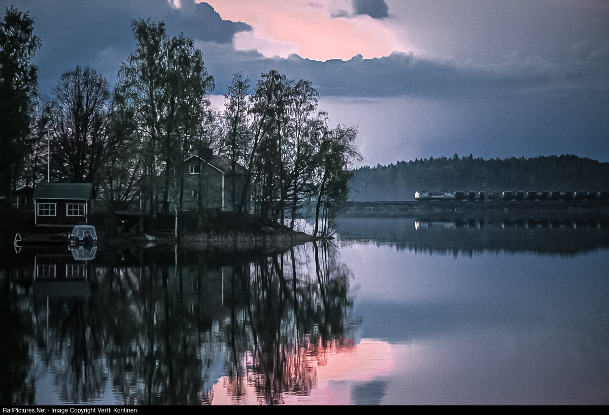 The quietness of a typical Finnish late spring evening gets broken for a moment when Sr1 wearing the green and white VR paint scheme crosses over Leppälahti with a tanker train bound for Uusikaupunki