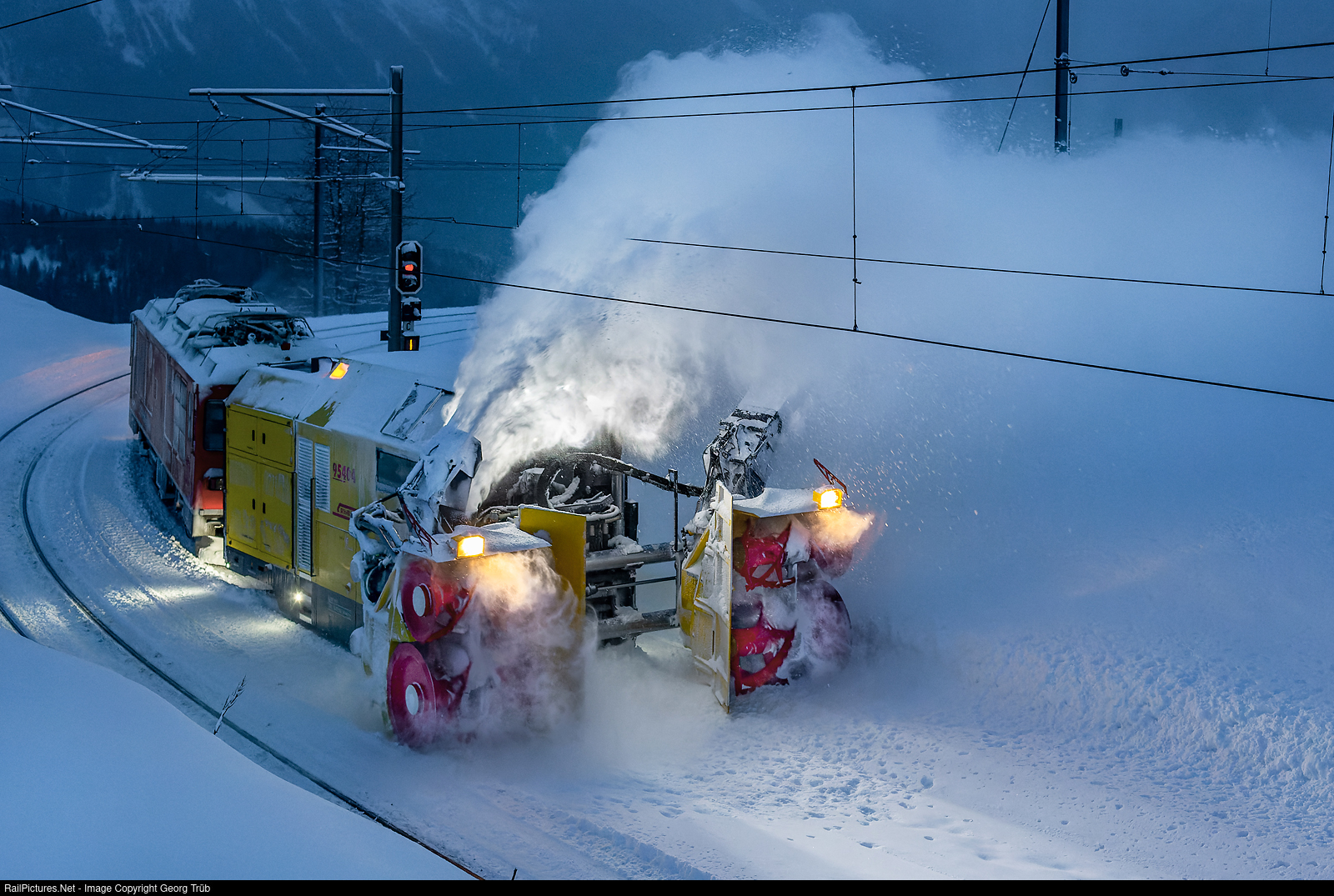 At 6.48 AM the snow fighting crew of Poschiavo reaches Alp Grüm on 2091 meter a.s.l. The dual power locomotive (diesel and 1000 V DC from the overhead wire on the Bernina line) Gem 4/4 # 801, built in 1966 and modernised in 2000, is shoving the "beast", snow blower Xrot mt # 95404, built by Zaugg in 2011. The Gem 4/4 is operating in diesel mode, which is usual in the snow fighting service.