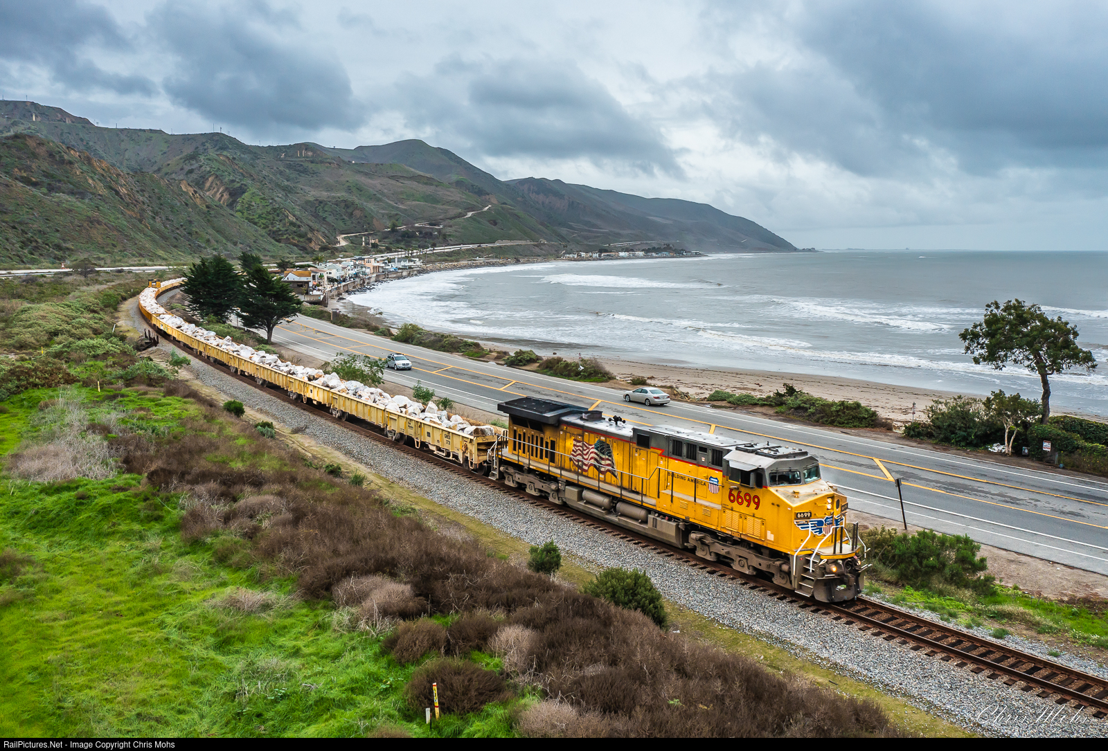 California has been hard hit by several storms off the Pacific Ocean with Flooding Rivers, Mudslides, Strong Winds, Trees Down and Bridges Washed out. On The Sierra Railroad on the Fillmore Branch the Railroad bridge over Sespe Creek was washed out with the Tracks suspended over the river. The Santa Barbara Subdivision was not immune to the storms either. The bulk of the problems are between Gaviota and San Luis Obispo. The Honda bridge on the central coast which was scheduled for work became undermined and closed to all traffic which shutdown the Coast Route. Several trains of rock are underway from the North and South to begin repairs. UP no. 6699 hauls a load of rock to the south side of the bridge, while other trains head to the Northside.