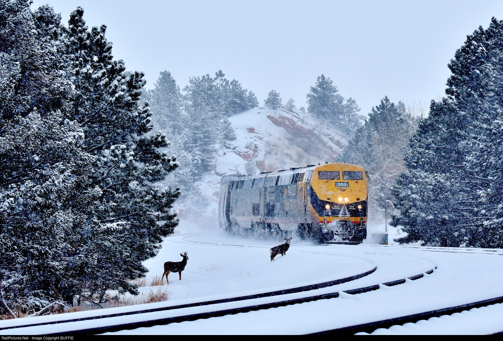 The California Zephyr runs through the S curves at Rainbow Cut in Plainview, Colorado as two deer check out the photographer. It was about this point where I went from saying 'stay there' as the train approached to 'dude, you better scram' as the train got uncomfortably close. Both deer sprinted to the trees on the left and were just fine.