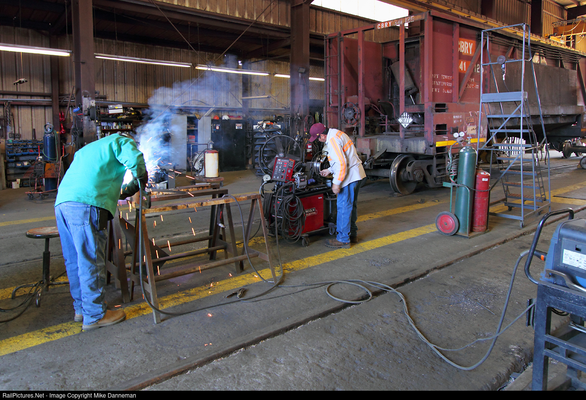 Two Copper Basin Railway employees work in the repair shop at Hayden, Arizona, on April 20, 2017. The shop is fully-equipped to make repairs to the railroad’s locomotive and freight car fleets, as well as other items such as track materials, etc.