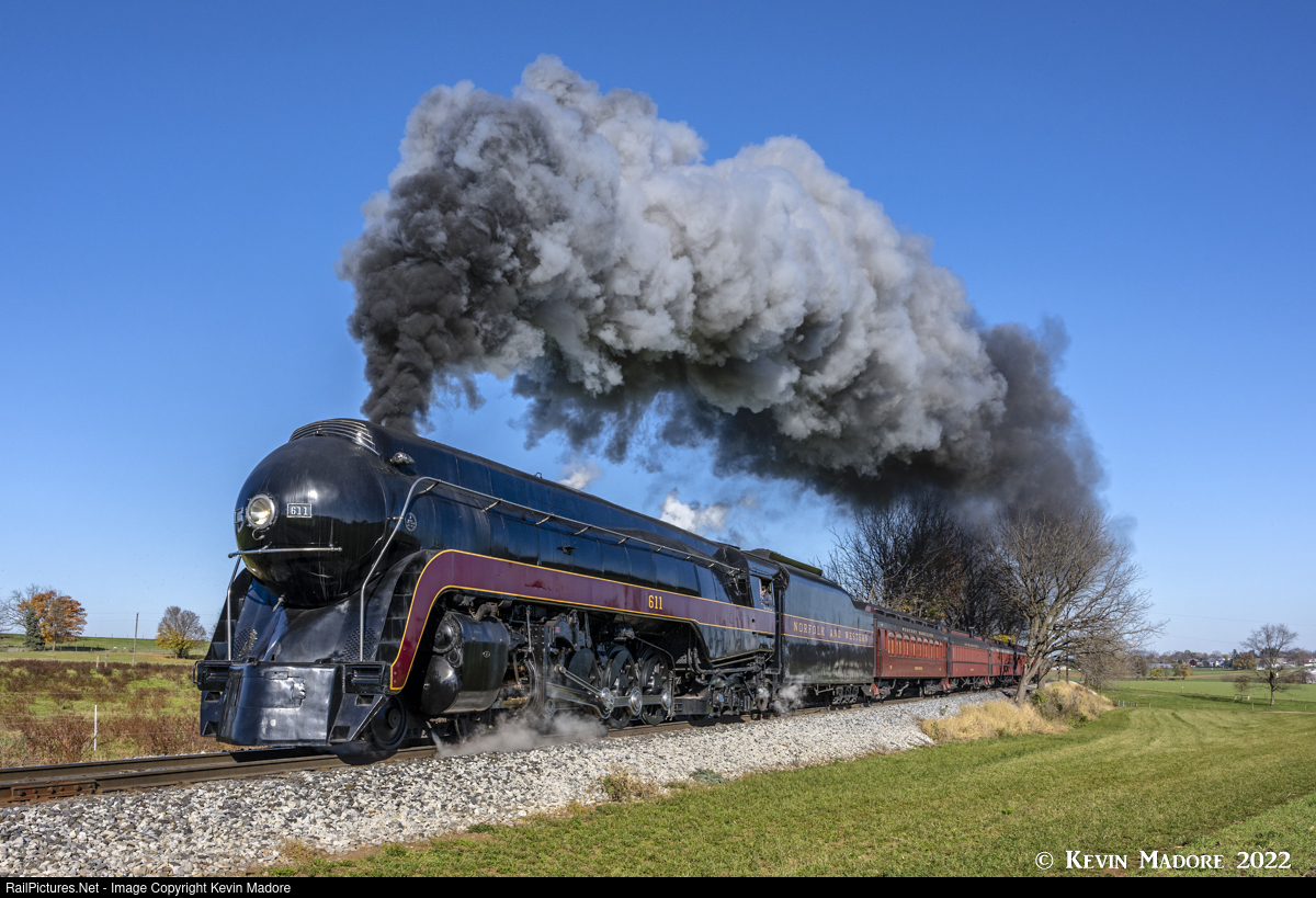 Barreling through Ohio farmland. Norfolk & Western J-Class Northern #611 looks right at home barreling across open farmland, hauling a 5-car express passenger train on a sunny November afternoon. But unfortunately, this isn't Norfolk & Western territory and sadly, she's not doing 60 mph. This is Pennsylvania's Strasburg Rail Road and the location is just east of the Black Horse Road crossing, which the railroad refers to as "Carpenters." In 2022 at least, this is about the only place where you can still see this locomotive stretch her legs just a little. Although it's not quite the same as seeing her charging down the NS main line like we could a few years ago, it sure beats a yard shoot in a museum at 10 mph. This image was captured during a November, 2022 photo shoot, organized by the Strasburg Rail Road and 611's owner, the Virginia Museum of Transportation.