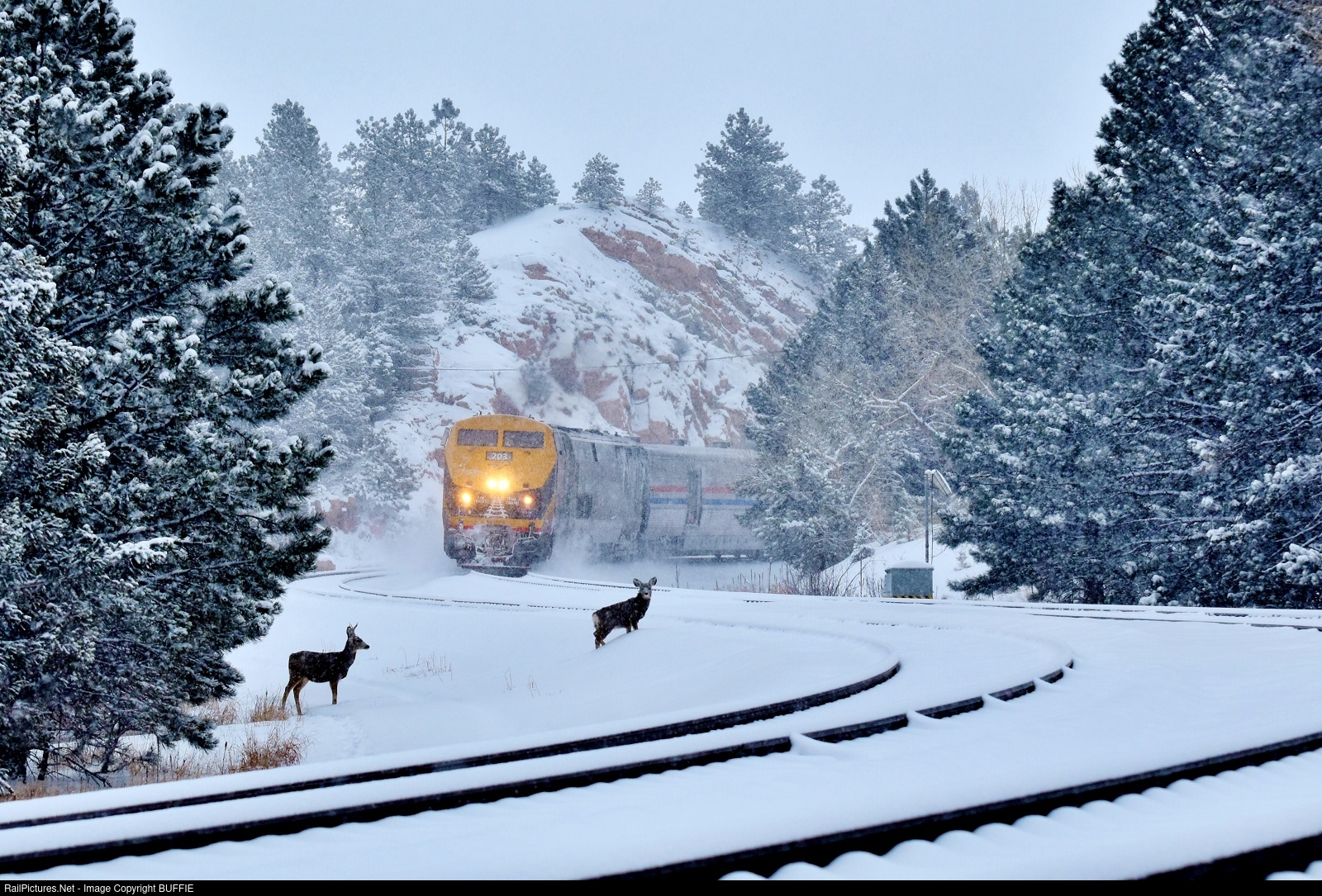 Heavy snow is blanketing the tracks as two deer are more interested in the photographer than the California Zephyr moving through the Rainbow Cut at Plainview, Colorado.