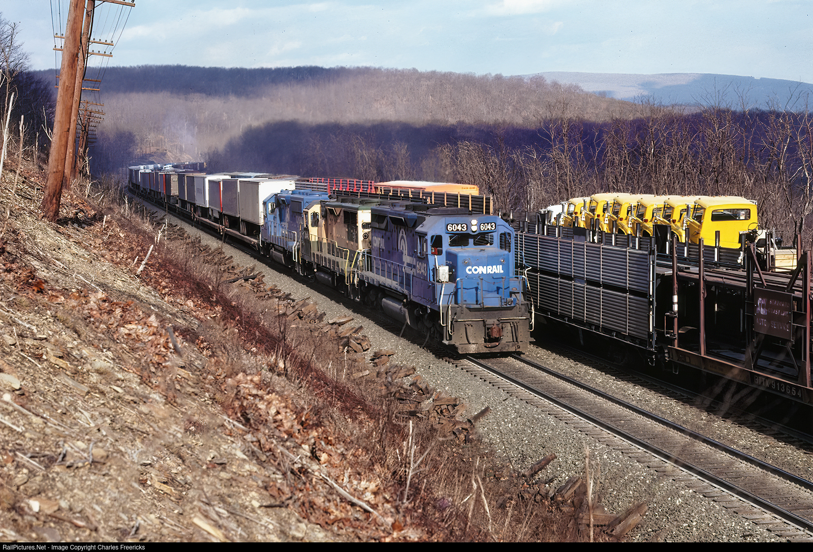 On April 17, 1979, my friend Paul Wester and his dad Pete Wester took me on a roadtrip to Horseshoe Curve. Back in those days, climbing over and around the hills there was far more acceptable. Here's one of our catches... TV61 with an SD35 leader, a GP35 sandwich meat, and a brand new GP40-2 trailer. SD35s were nothing that impressive back in those days. Can't remember the last time I saw one.