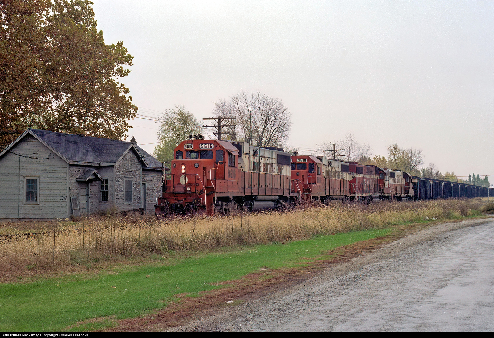 I was driving from St. Louis to Chicago, in a persistent but light rain. It was November 4, 1986, where traveling north on I-55, I saw the only Illinois Central Gulf train I would actually ever see in my life. (Years earlier I had been very seriously considering Principia College and planning out all the railfanning I was going to do of the ICG from campus, but I didn't end up going there). Anyway, when I saw this train, I had no idea what town I was near, what line this train was on, where it was going or where it was coming from. I did a quick u-turn and got off the interstate at Brown Road in Divernon. Spotted an old train station a block south, drove up to it, took this shot (and a going away) and then got back on the interestate. Years later I put together what I had shot. Shot from west of the tracks on a RR owned road at MP208.9. The train is coming from Freeman Coal Crown III mine west of Farmersville, IL which opened in 1981 (about 10 miles south). The train is northbound with three ICG GP38-2s and one GM&O GP38-2 and a string of bathtub gons. This track was originally the Jacksonville Southeastern railroad. In 1899 the Illinois Central bought the railroad for the Madison Coal Corp. mine #6 in Divernon (it produced the most coal in the state between 1900 and 1930, it closed in 1925!).