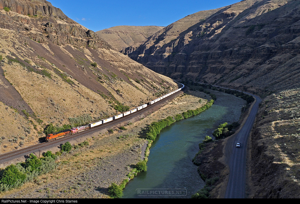 | Southbound BNSF intermodal train working its way through the Deschutes River Canyon at Oakbrook, Oregon. [June 2018] |