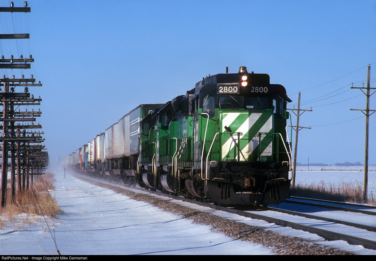 Burlington Northern “Expediter” train 46 flies eastbound toward Somonauk, Illinois, on the frigid winter day of February 17, 1990. Leading the train is BN GP39M No. 2800, rebuilt from CB&Q GP30 No. 973, later becoming BN No. 2250, and still looking like a GP30 in BN’s original paint scheme.