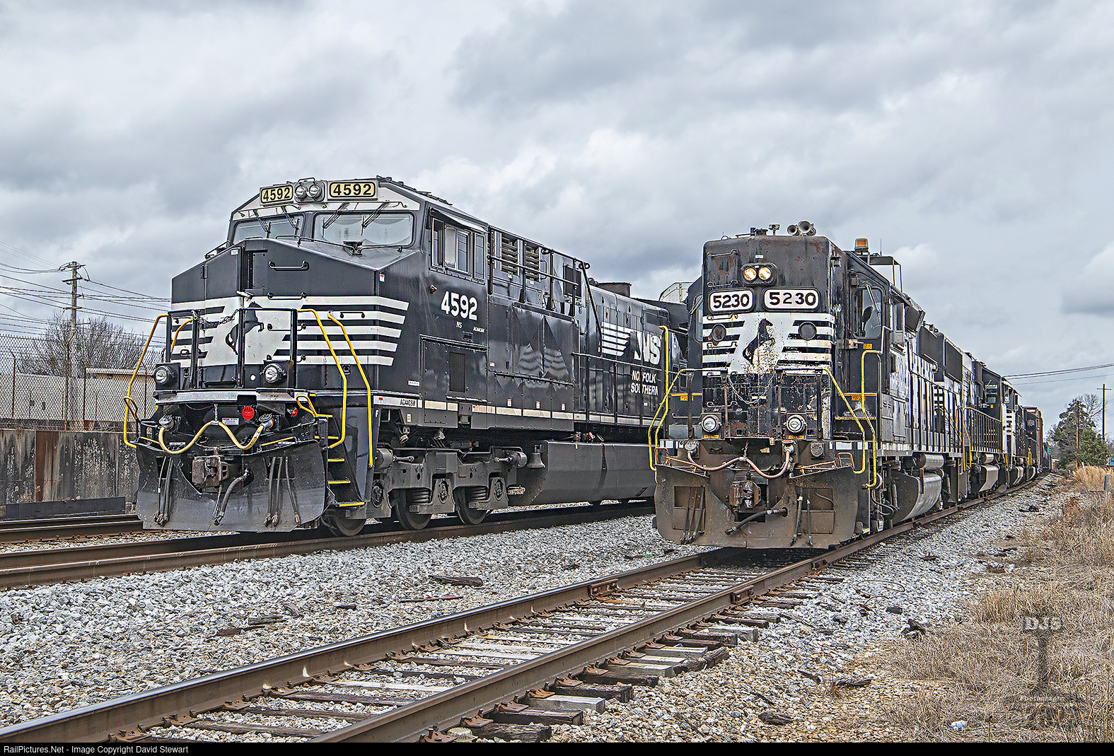 | NS G70 with a G72 recrew, 5230 has shoved part of it's Industry Yard cut up Old Main Track 3 at CP Tillman as NS 189 with 4592 stands on Main 2 at East Point, Georgia. January 2023 |