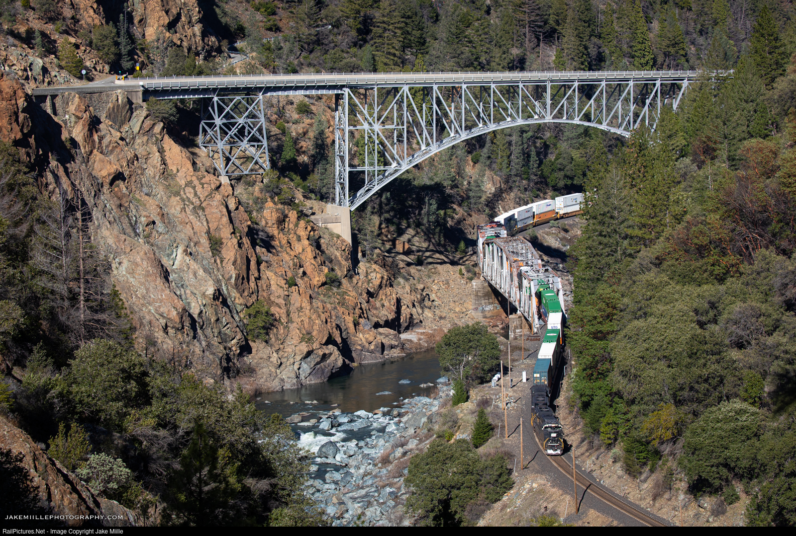 Recent heavy rains wreaked havoc on the Feather River Canyon. Due to a rock slide and derailment near Belden, Union Pacific’s Canyon Subdivision had been out of service for nearly a week. Highway 70 was also closed due to rock slides. Union Pacific and BNSF were forced to detour all trains via Donner Pass and the Shasta Route. The NS 1073 was one of the first trains to run through the canyon once the derailment was mitigated. |