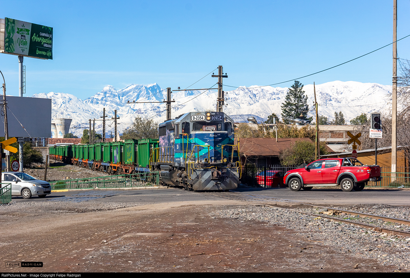 On a cold winter morning, all cars stop at Manso de Velasco avenue in San Felipe, to give way to the "Andina", led by Fepasa's 2354, which begins its journey towards Ventanas. In the background, thanks to a heavy snowfall the night before, both "Alto Los Leones" and "Nevado Juncal" can be clearly distinguished.