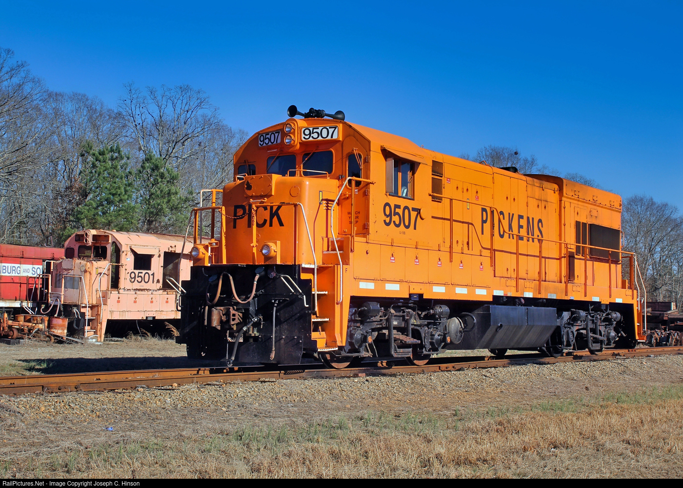 Pickens Railroad 9507 lays over the weekend at a spot on the map called Docheno in Anderson, South Carolina. She was built by GE in 1974 as Seaboard Coast Line #351, to Seaboard System #1949. CSX was formed through various mergersof older lines and while this unit initially kept the number 1949, CSX eventually painted her in a stand out orange scheme for Maintenace of Way Service and renumbered her 9507,
