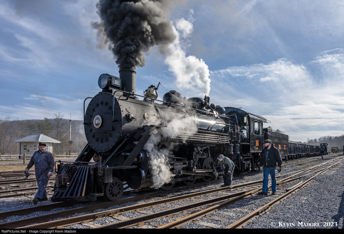 Breaking in a new horse. Wednesday, February 1st of 2023 was a monumental day in the re-birth of the East Broad Top Railroad in Rockhill Furnace, PA. On this day, the first steam locomotive to be restored to active service by the EBT Foundation made its first moves under power, completing a rebuilding process which has taken nearly 3 years. Pictured here is EBT #16, the first of the "big boiler", superheated, Mikados purchased by the railroad in 1916. This engine was the last to be overhauled by the EBT before the railroad shut down as a common carrier in 1956 and she was never run during the tourist era. Judged to be in perhaps the best condition of the 6 engines in the roundhouse, she was selected to be the first to be returned to service. The operation you see here was her first movement under steam in 67 years.