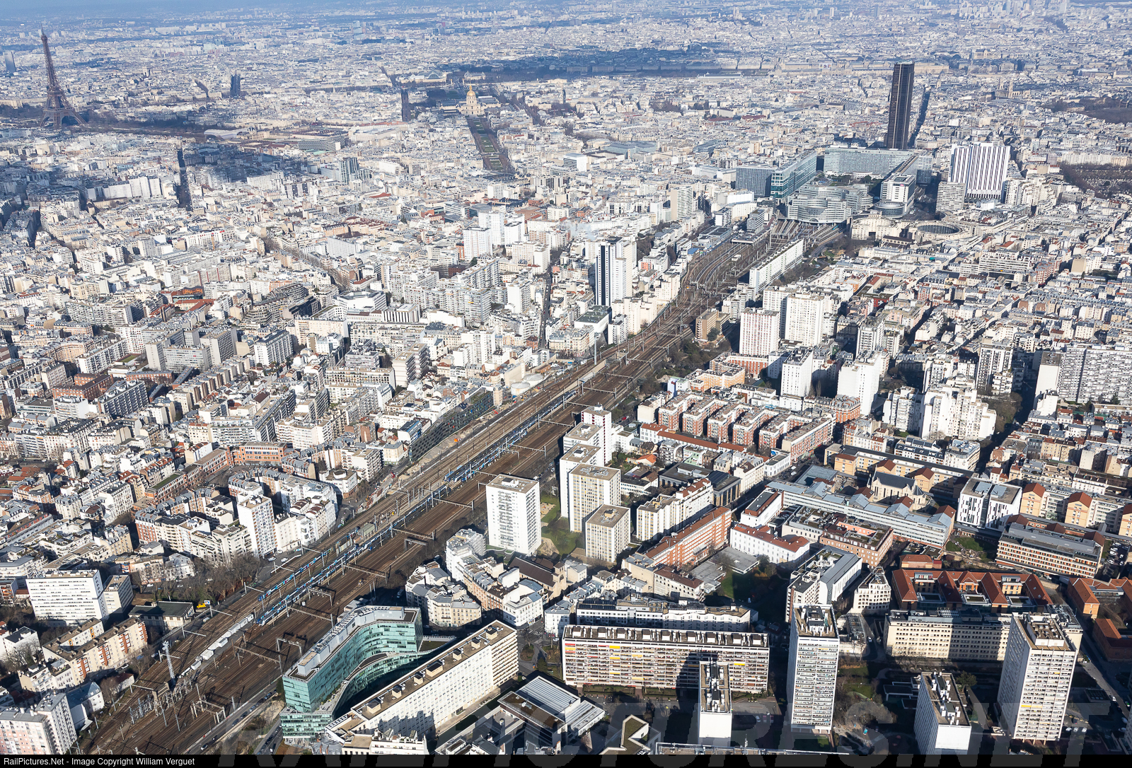 Z 55500, Z 57000 and Z 26500 parked on the tracks before Montparnasse station, in the upper right corner. Eiffel Tower in the upper left corner and Dome des Invalides in the center