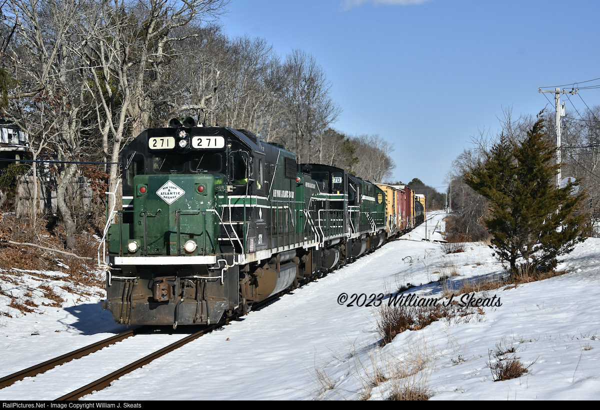 | NYAR RS71 with GP38-2 271, MP15AC 159, GP38-2's 270 & 261 at MP69 along River Road and AH Block in Calverton. |