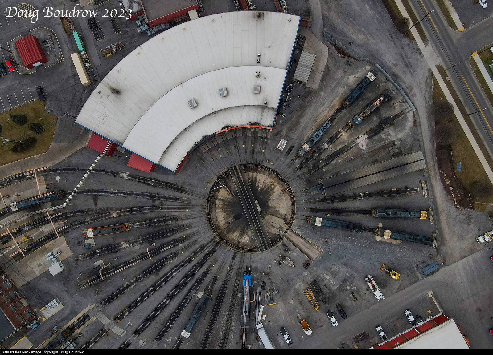 The CSX Cumberland roundhouse is seen from above. Several units are seen in the photo including a couple of visitors.