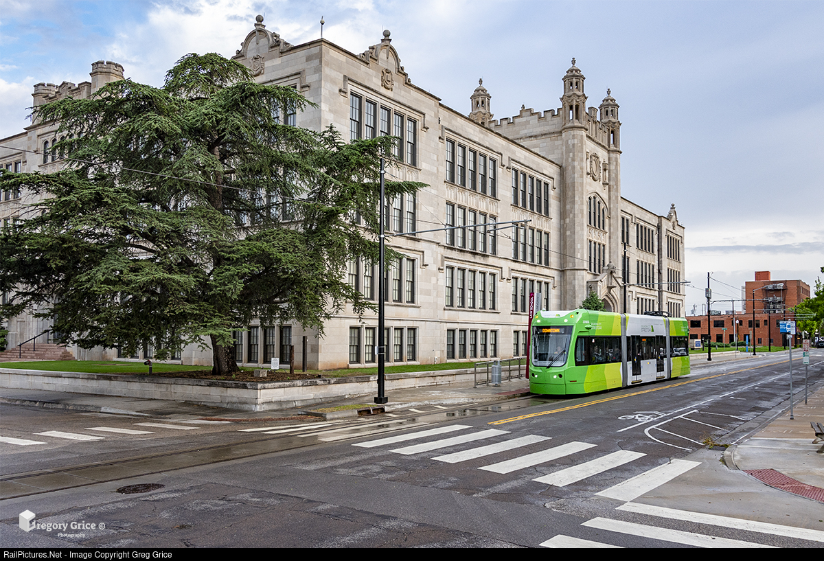 An Oklahoma City Streetcar makes a station stop at the Oklahoma City University School of Law on the wet morning of May 4th, 2021. The "Law School" stop is one of a handful of spots along the route where the streetcars drop their pantographs to utlize a battery feature equipped on the system's Brookville built Liberty Modern Streetcars.