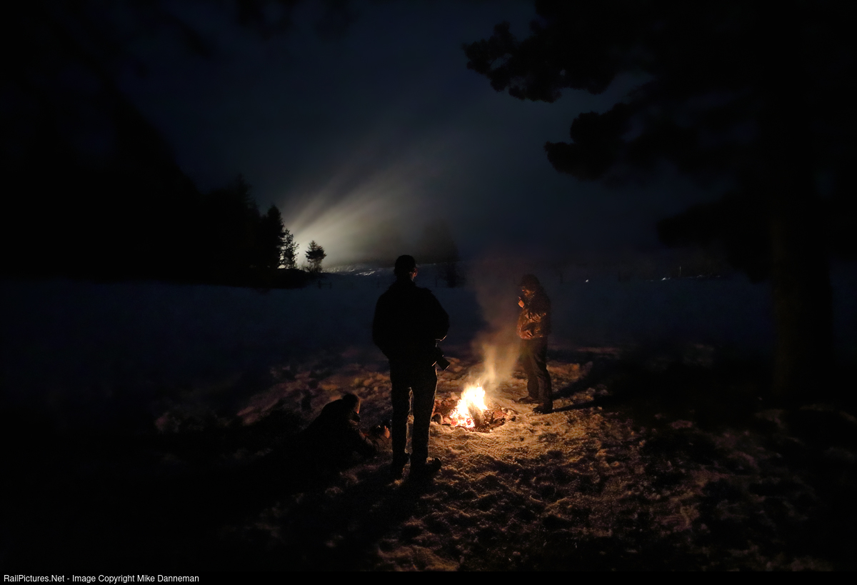 In my mind, there’s hardly anything better than a few beers around a campfire on a crisp, snowy Montana evening along the Clark Fork and Montana Rail Link’s busy Fourth Subdivision. Friends Dave Gayer and Robert Edgar enjoy the warmth of the trackside fire as my brother Tom seeks a low angle for the quickly approaching BNSF train that is sending up beams of glowing light into the moist night air at Trout Creek on February 4, 2023.