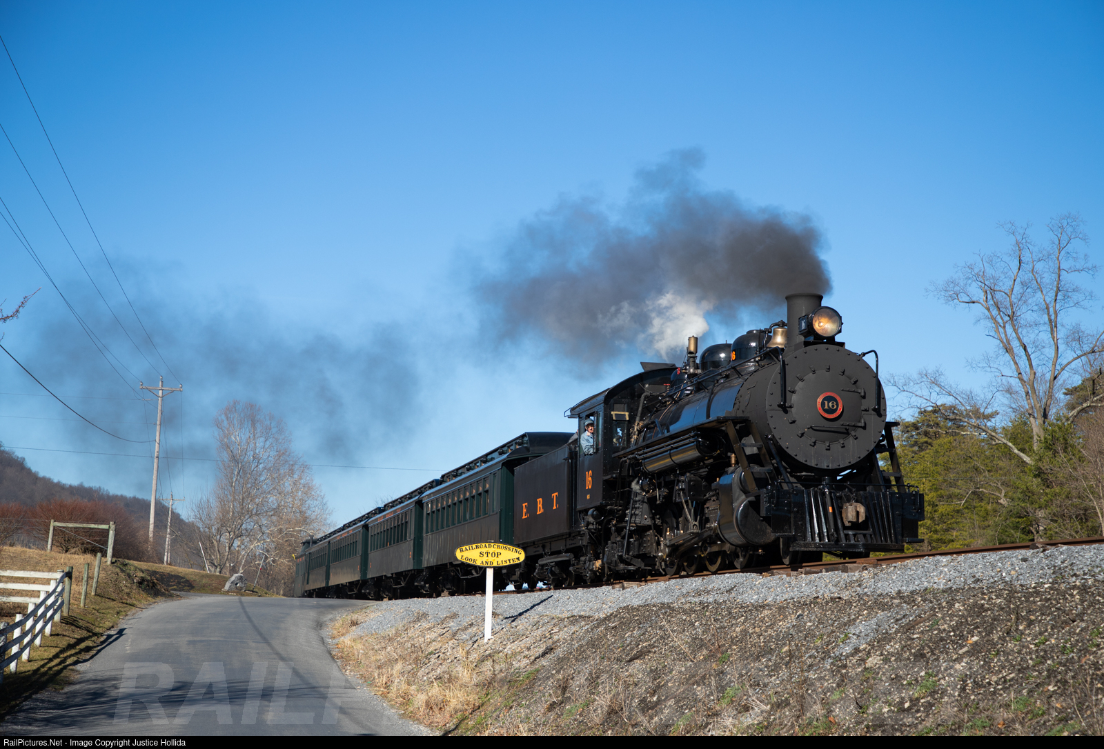 | East Broad Top 2-8-2 no. 16 cruises downhill at Enyeart Road, past one of the beautifully restored cast iron crossing signs that grace the EBT right of way. |