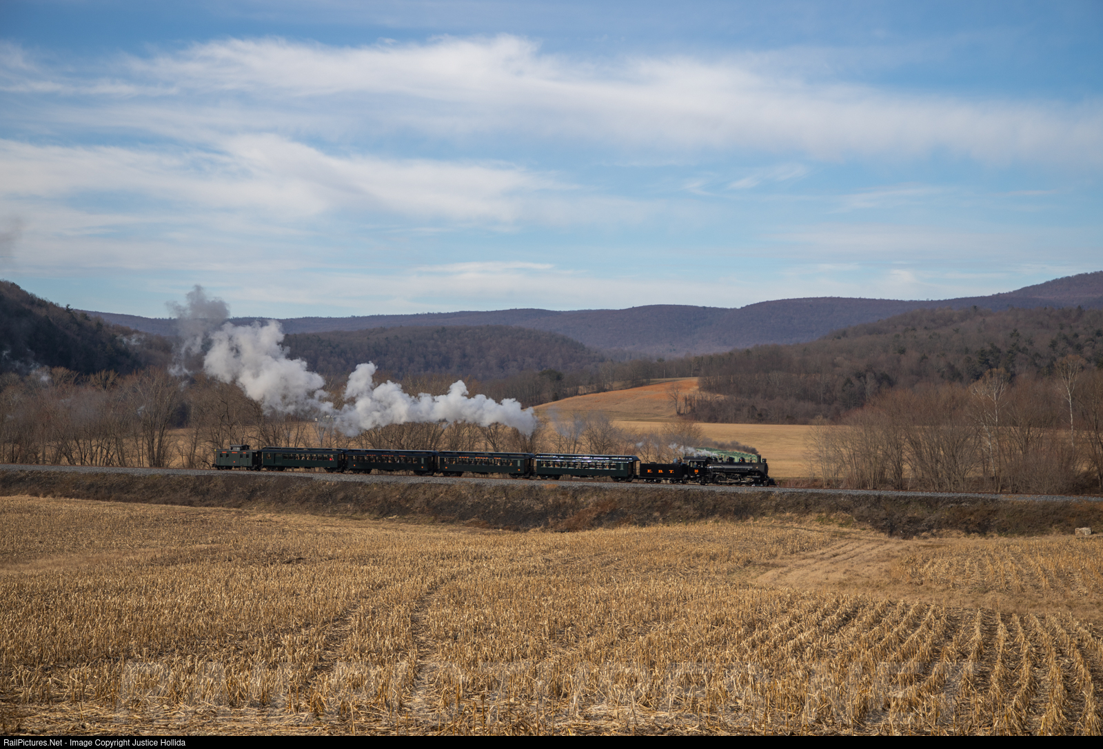| E.B.T. 16 coasts downhill at the fill just short of Runk Road, with the Allegheny Mountains providing a scenic backdrop for the train. |