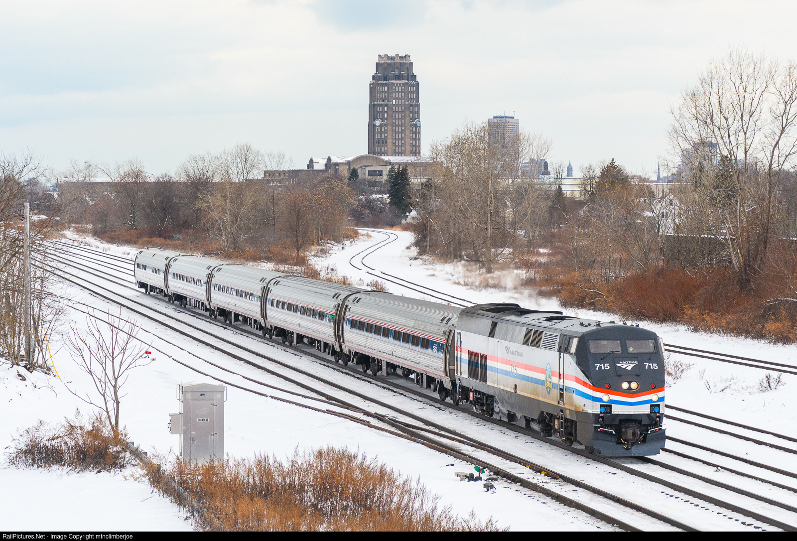 | With P32AC-DM 715 leading the way, Amtrak Empire Service train 288 cruises through Buffalo, New York over CSX's Buffalo Terminal Subdivision and passes by the old Buffalo Central Terminal building. The train has completed its Buffalo stop at the Exchange Street Station is now heading towards the stop in Depew only a few miles away. |