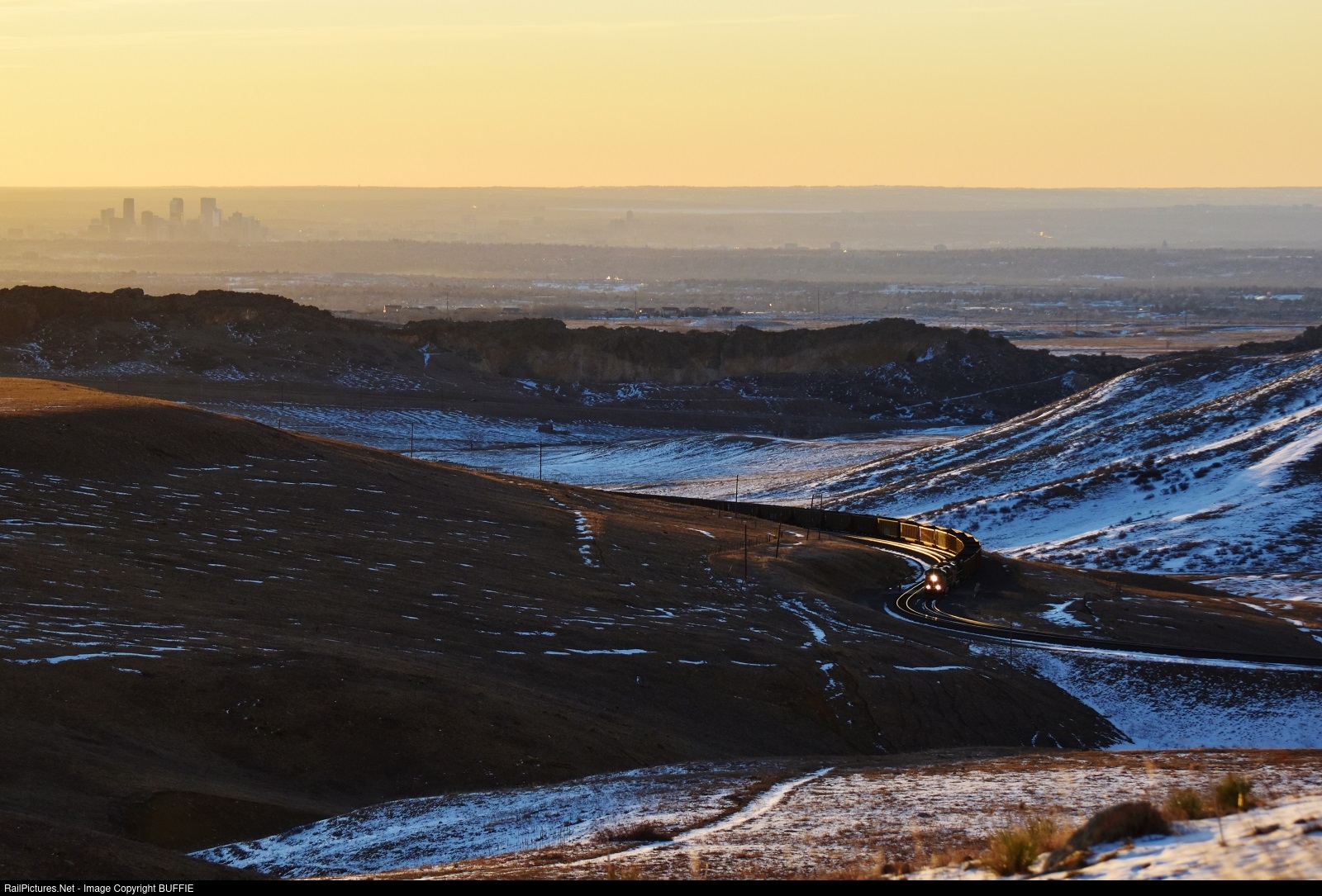 Dawn just starts to break with the Denver Skyline in view as UP 5430 (ES44AC) brings a coal train into the siding at Rocky, Colorado.