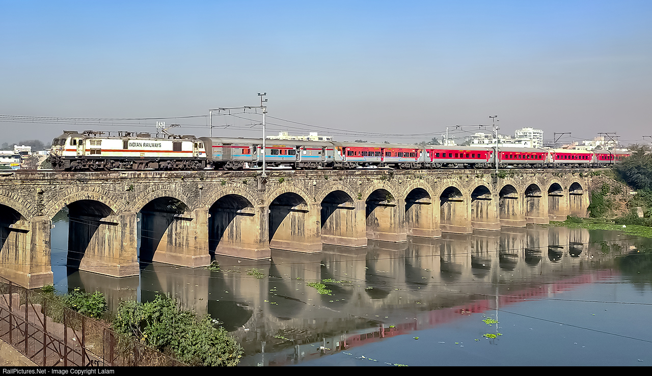 WAP-7 type locomotive hauling LHB rake of Indore-Daund daily express over Harris bridge.