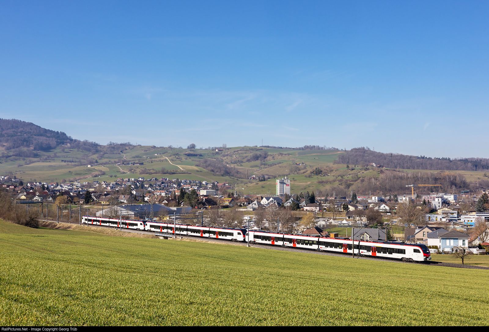 | "Flirt Mouette" (seagull) RABe 523 # 511, # 507 and # 506 of the SBB in multiple control are running the Interregio 2068 of the line IR 36 from Zürich Airport via Zürich-Dietikon-Baden-Brugg-Frick-Rheinfelden to Basel, on the Bözberg north ramp between Hornussen and Frick. |
