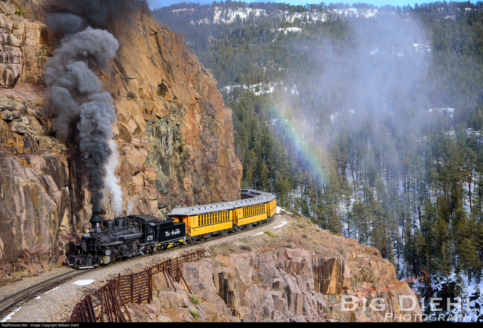 It's 1973, and the Denver and Rio Grande Western is running over the the high line on the Silverton Branch. The K-28 476 is leading this train along the High Line with its iconic diamond stack.