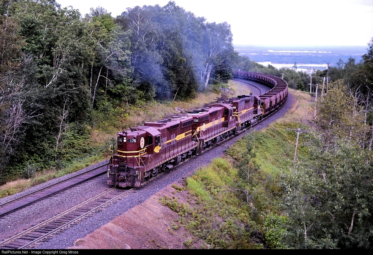 DMIR 176 grinds up Proctor Hill with an empty ore train in September of 1987. Much has changed here over the years. The DMIR is now the CN, the line has been single tracked, and a hotel resides in the trees to the left.