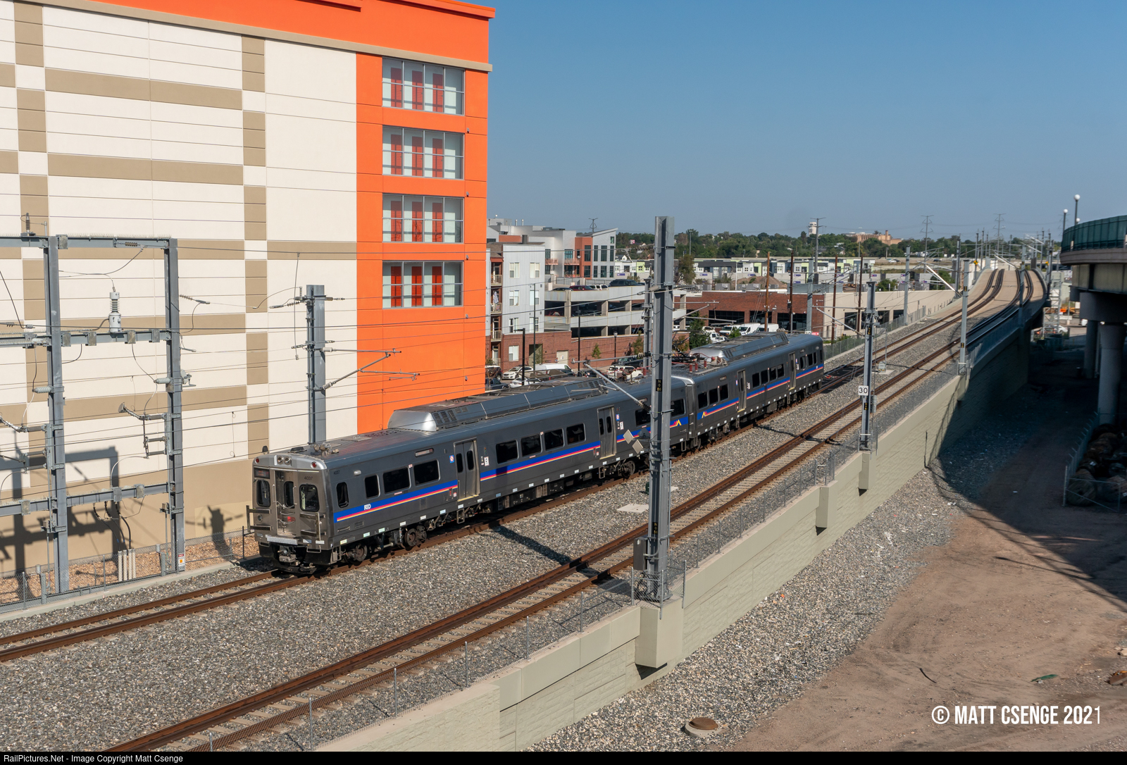 An inbound RTD B Line train led by Silverliner V no. 4037 (Hyundai Rotem, 2009-2016) descends the flyover towards Union Station, its final stop in Downtown Denver. |