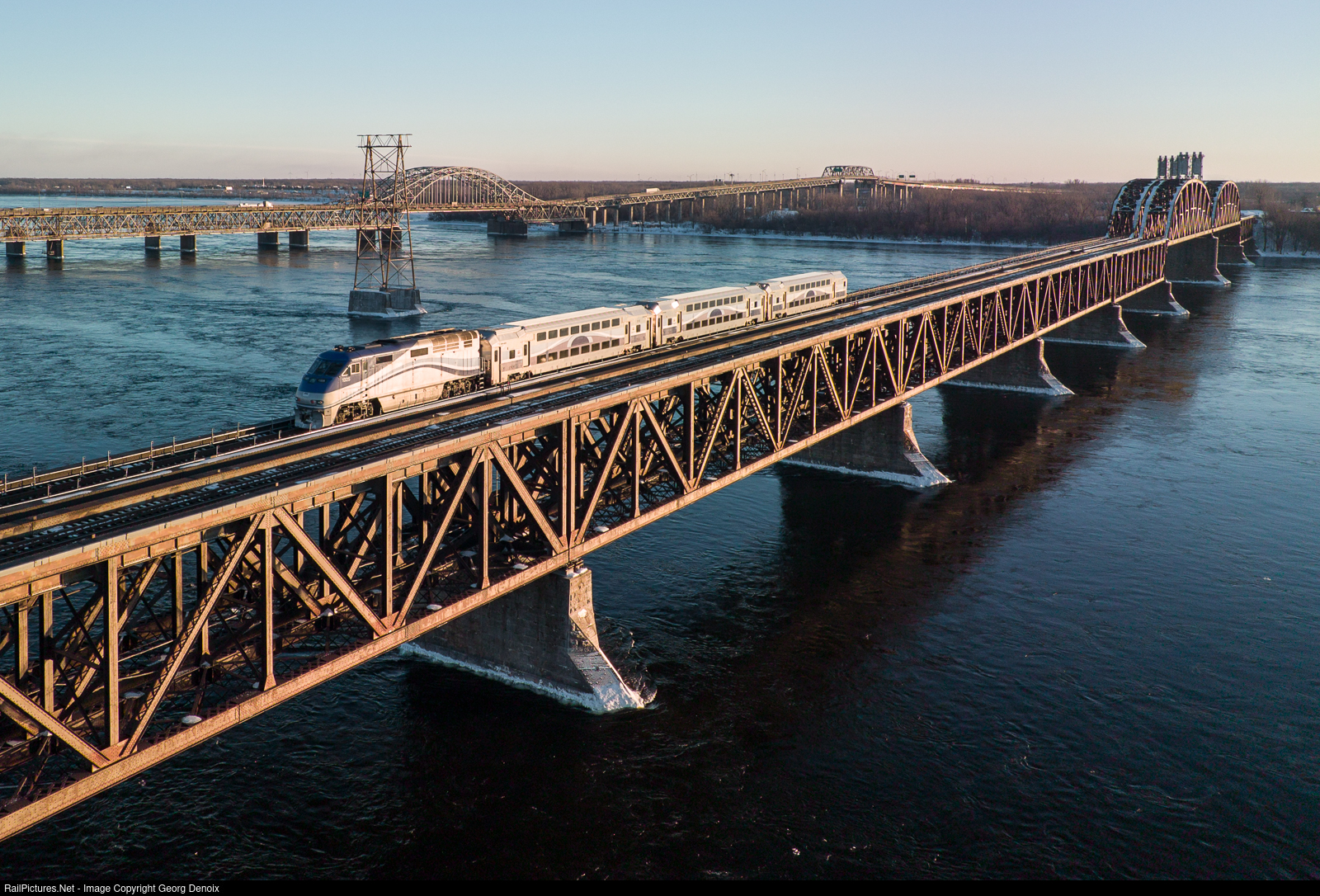 A late-afternoon Candiac commuter (no. 85) is heading south over CP's Saint-Lawrence bridge on the Adirondack subdivision, with the Mercier bridge in the background.