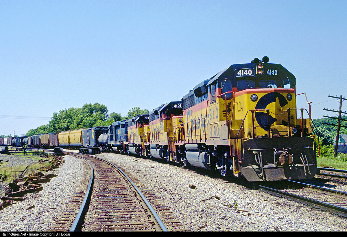 A Chessie System eastbound freight led by B&O 4140, an early GP40-2, built in October 1972, pauses at New Castle, PA behind a Safety Special led by C&O steam locomotive 614 (not shown). I visited EMD in La Grange, IL in September 1972 during their 50th Anniversary open house, and these Chessie GP40-2s were under construction there at the time. Chessie was the brightest color scheme in the Northeast at the time.