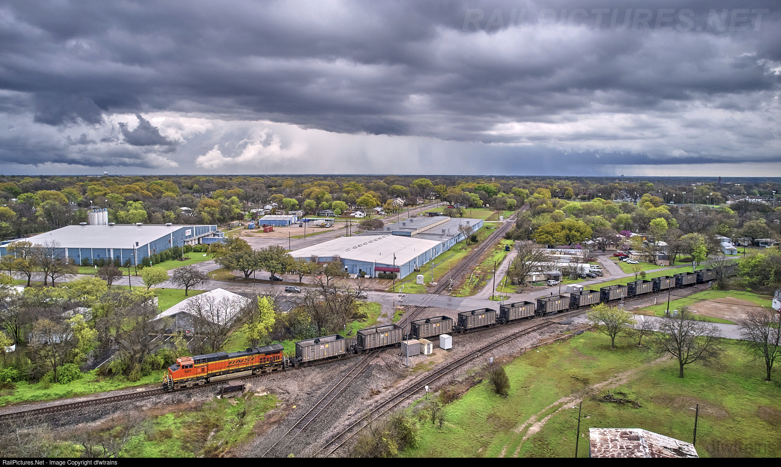 | Dash 9 leader with a west Bound empty rock train crosses the UP / BNSF Diamond on the BNSF DFW sub as an impending storm starts to engulf pretty much most of the Dallas Fortworth Metroplex. |