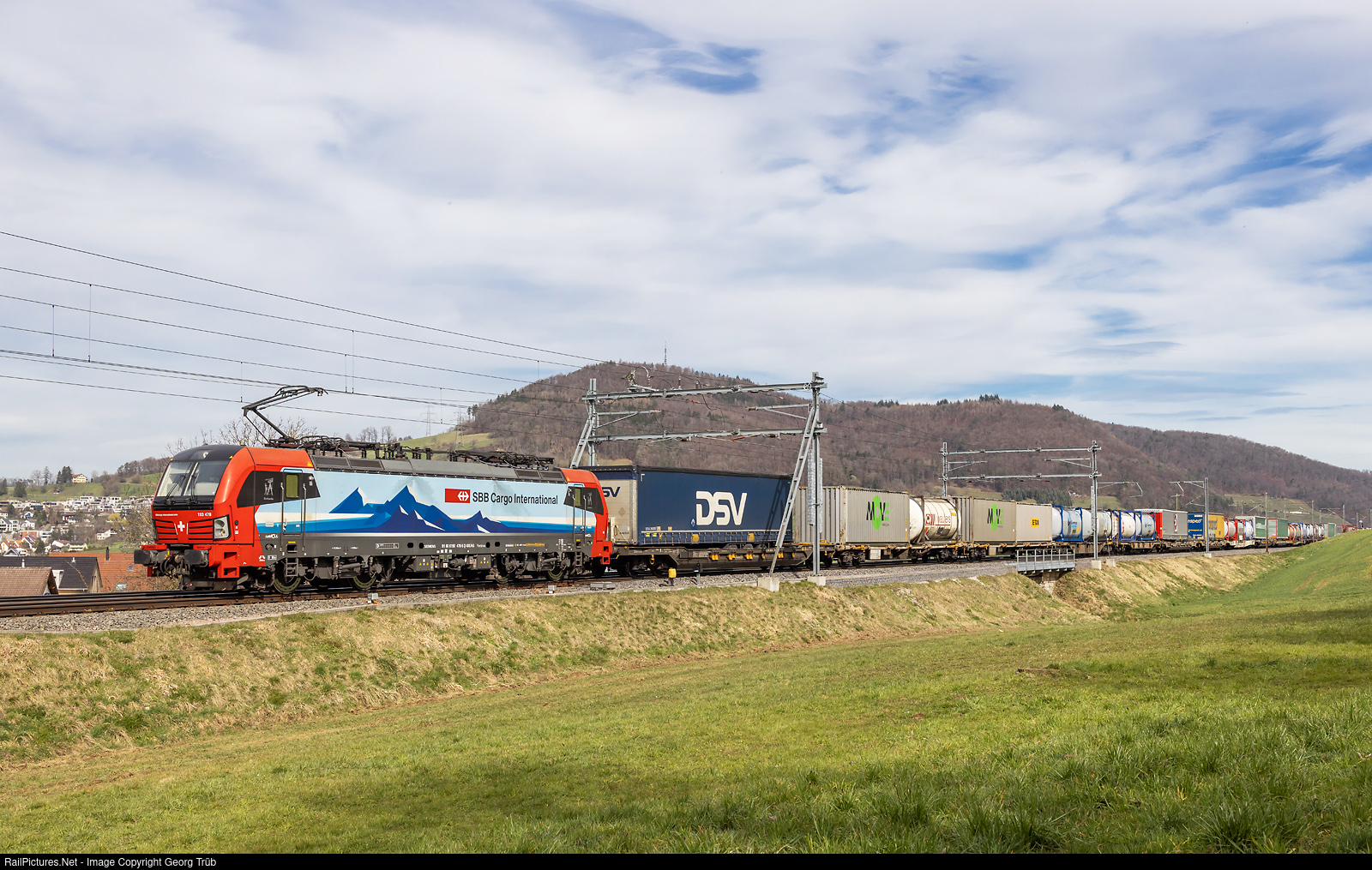 | Siemens "Vectron" 193 # 478 "Gottardo" of the LokRoll leasing company, rented to SBB Cargo International, is pulling the northbound intermodal train 40248 from Gallarate/Italy via Luino-Gotthard Base Tunnel-Bözberg-Basel to Antwerpen-D. S. Oorderen/Belgium, between Hornussen and Frick. |