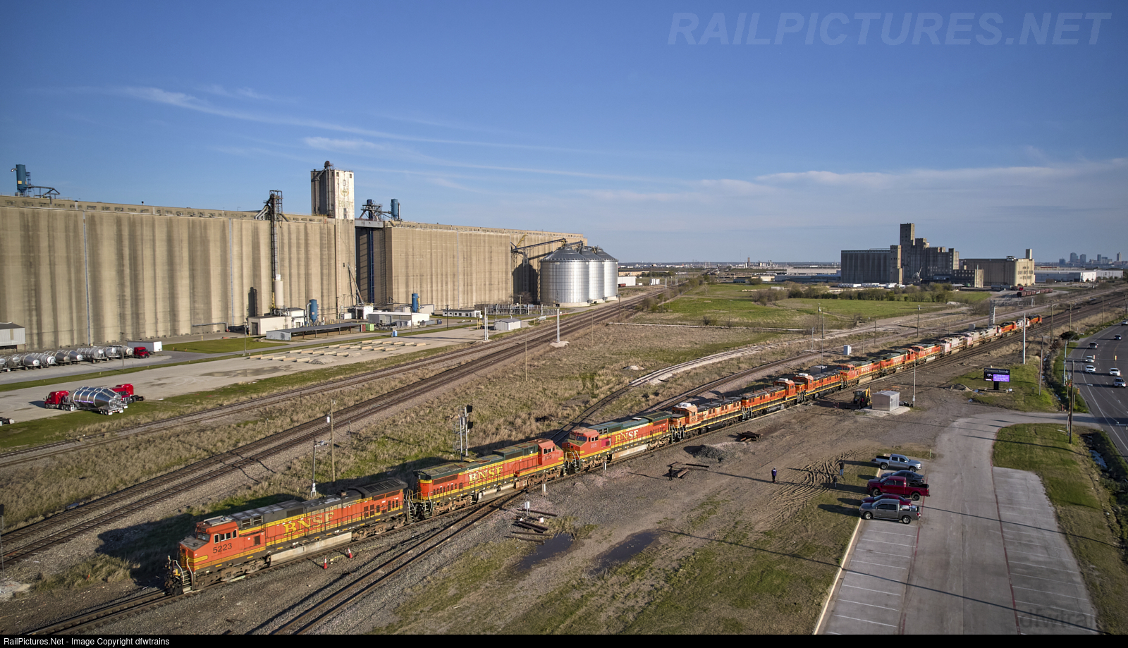 BNSF Power Move (D-GATSTL) from Galveston, Tx to St Louis, MO with 13 Locomotives to be delivered to LTEX, Ohio passes by the Saginaw Grain Elevators. The Lead Unit #5223, a Dash 9 and the DP Unit #8291, an ES44C4 will take the train till STL before handing them over to CSXT