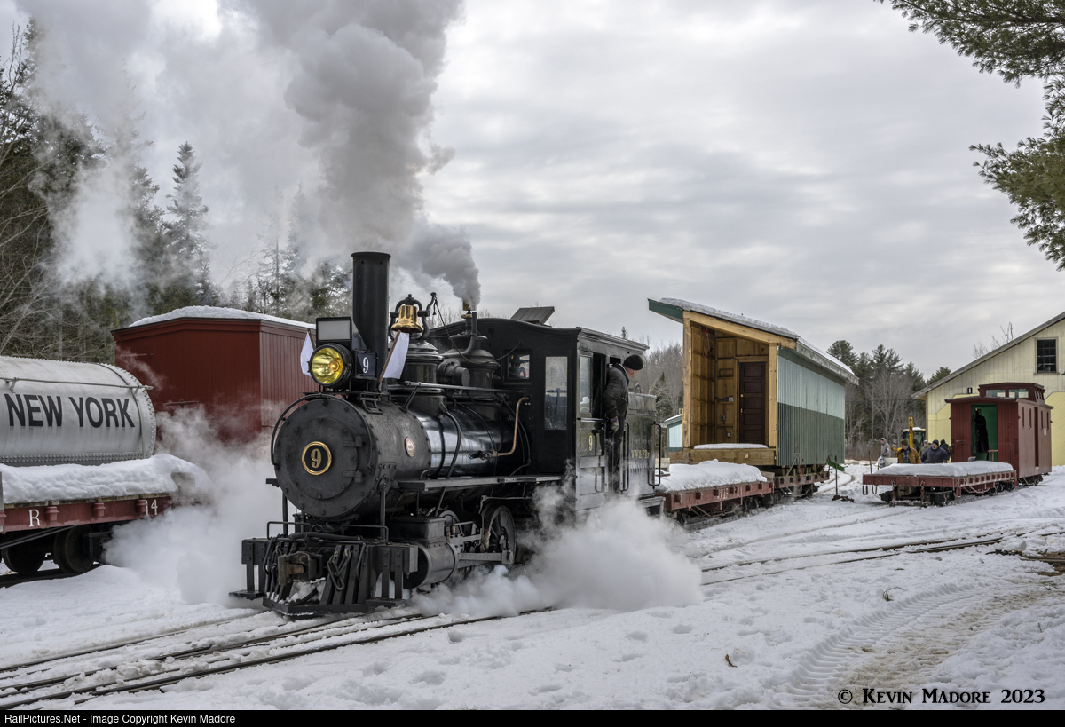 Handle with care: A "high profile" load on the WW&F - Part 3. Beginning her slow crawl through the Sheepscot Yard, WW&&F #9 passes a second idler flat and Caboose 320, which can be seen on the right. Shortly, after passing through the 3-way stub just ahead, the train will back onto the Bay #2 Shop Lead to collect these two cars and the "High Profile Extra" will be fully assembled and ready to head north.