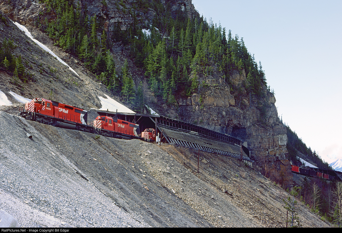 CP 5832 leads an empty sulfur train eastward up Kicking Horse Pass out of Field, BC. The train is exiting a tunnel and snow sheds as it approaches an ice field slide area. The train will continue up the grade through the Spiral Tunnels and pass through Lake Louise and Banff on its way to Calgary, AB.