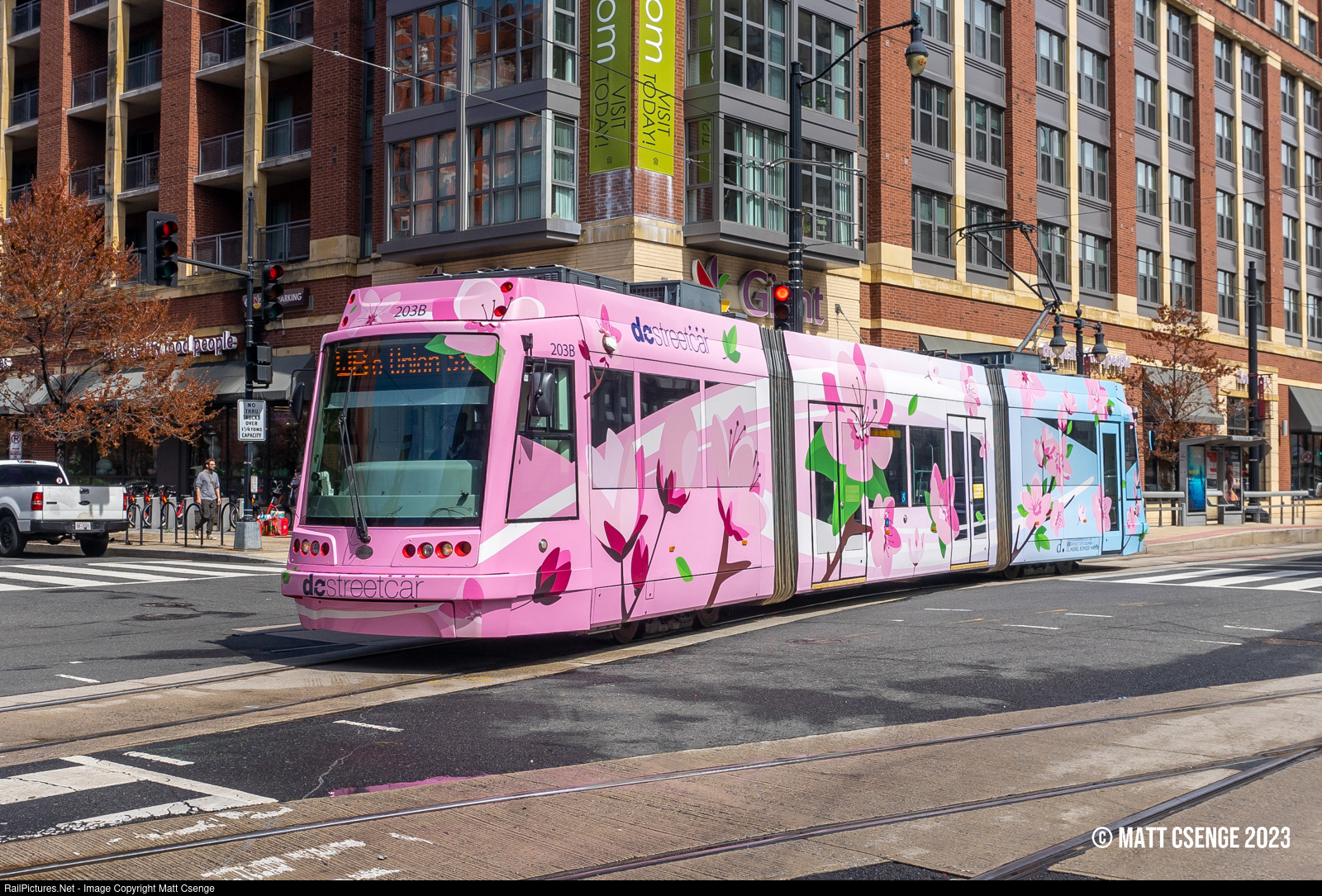 DC Streetcar car no. 203 (United Streetcar model 100, 2013-2014) is seen crossing 3rd St NE as it switches onto the track to the Union Station terminal. The streetcar is decorated with a full wrap celebrating springtime and the city's iconic cherry blossoms!