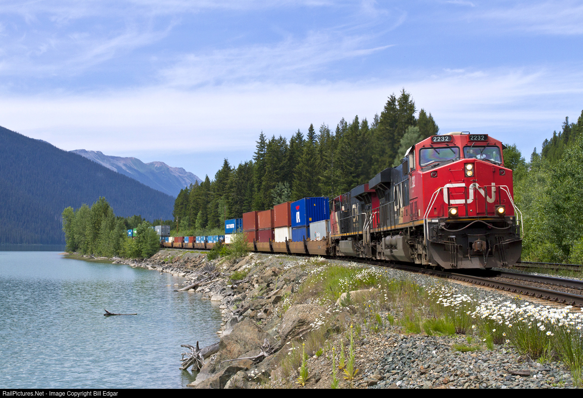 | CN 2232 leads a stack train eastbound along Moose Lake as the train approaches Yellowhead Pass and the Alberta border. It will stop at Jasper, AB for a crew change before heading to Edmonton and points east. |