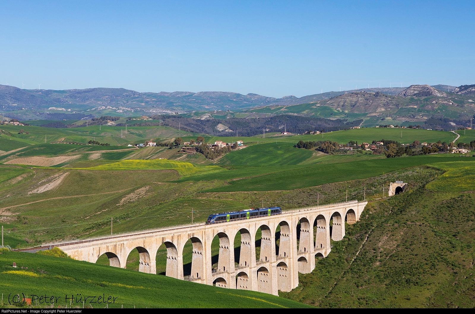 | Sicily: most of the time in the year a dry and therefore yellow/brown landscape, But in spring it could be green and colorful. Here we see an unidentified ALe 501 "Minuetto" as Regionale 21509 from Caltanisetta-Xirbi to Caltanissetta Centrale passing this wonderful stone viaduct short before getting to its final destination. |