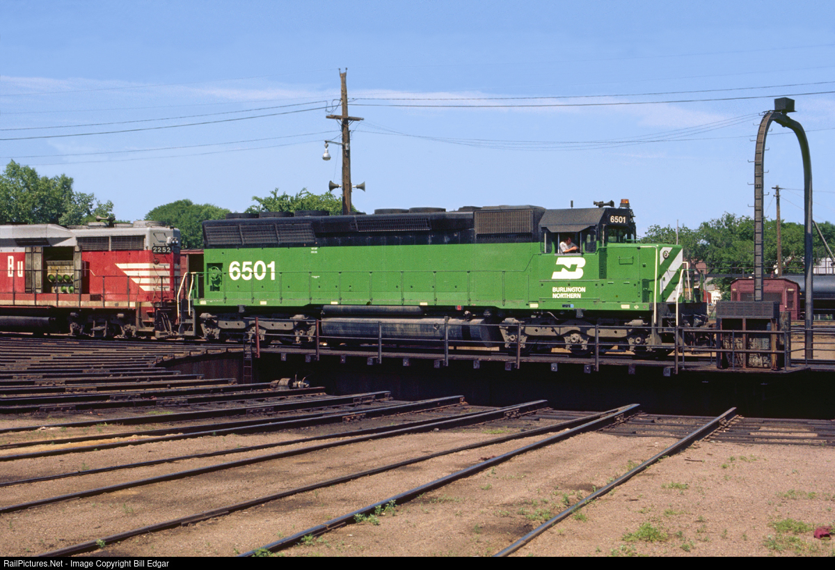 BN SD45 no. 6501 is being hostled at the Harrison St. turntable at BN engine facilities in Minneapolis, MN. This unit is a good example of the later production of SD45s made by EMD. First, BN chose to use GE style cab side windows, a carry over from Northern Pacific. Second, the unit featured the extended dynamic brake design that would be normal on SD40-2s starting in 1972. BN 6501 was built in May 1971, and later became WC 6502 (later 7502).