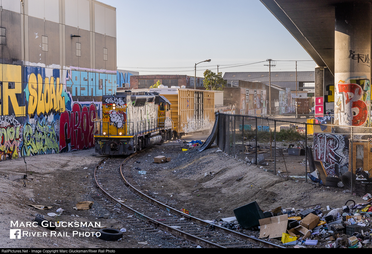 Box Pulling. Returning from City Fiber Inc. in Vernon, California with a box car, UP 1373 (née-Southern Pacific 3198, EMD, GP40P-2, 11/1974) crosses East 23rd Street in Los Angeles, California on the return to J Yard with its signature “flatback” showing. This engine is one of 16 GP40 variants built by EMD for passenger service, its extended body capped with a flat back to accommodate a steam generator. Of the 16, this and sister unit 1375 are the only ones left with unusual feature. The others, Indiana Harbor Belt 4010 GP40P-2 and the 13 ex-Central Railroad of New Jersey units that now serve New Jersey Transit, have been rebuilt and have the more familiar angled cap.