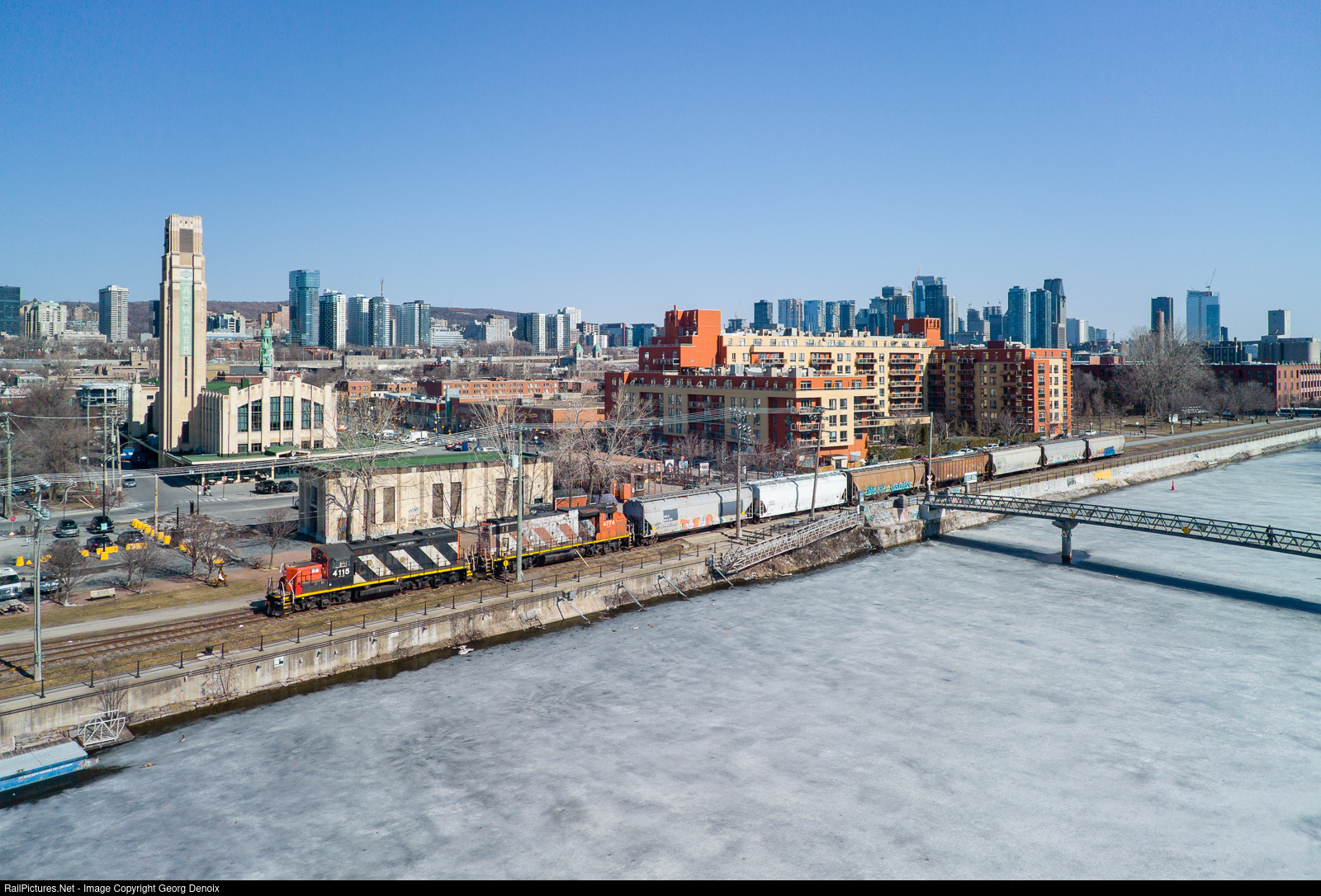 With CN 4115, a GP9RM makes an appearance on CN's Pointe-Saint-Charles switcher, in charge of delivering grain to Ardent Mills, last freight customer on Montreal's (still partly frozen) Lachine canal, passing here in front of the Atwater public market.